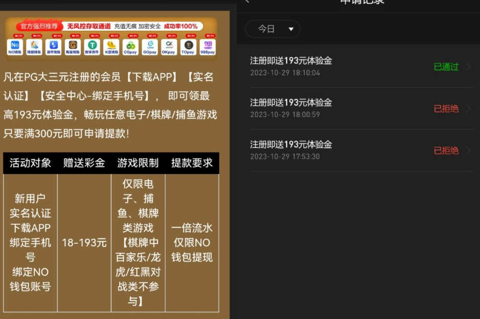 活动详情:新用户下载APP注册完善资料绑定NO钱包优惠活动里自助申请18~193彩金限制电子捕鱼棋牌最低300提现