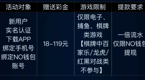 活动详情:新用户下载APP注册完善资料绑定NO钱包优惠活动里自助申请18~119彩金限制电子捕鱼棋牌最低300提现