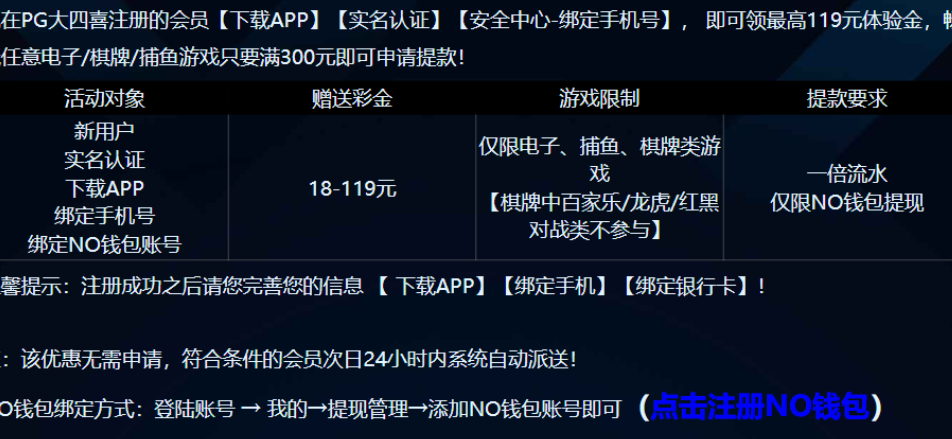 活动详情:新用户下载app绑定完善个人资料+NO钱包,只能绑一个账号,24小时内系统自动送18-119。属于比较大众的台子了,要么就白嫖